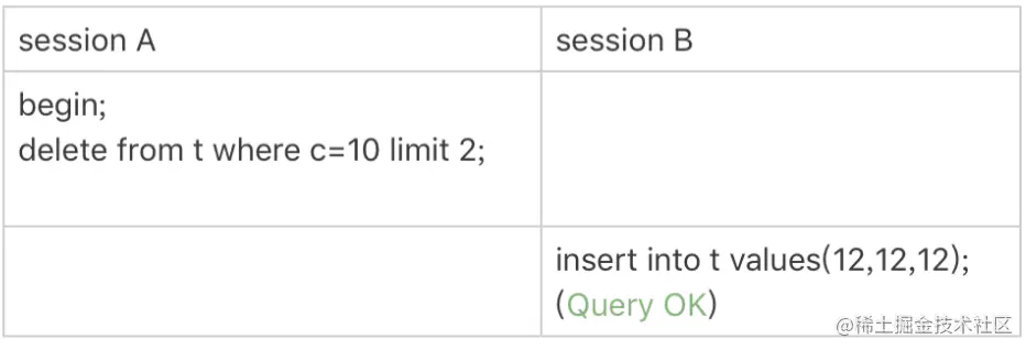 session A 的 delete 语句加了 limit 2。你知道表 t 里 c=10 的记录其实只有两条,因此加不加 limit 2,删除的效果都是一样的,但是加锁的效果却不同。可以看到,session B 的 insert 语句执行通过了,跟上个案例的结果不同。