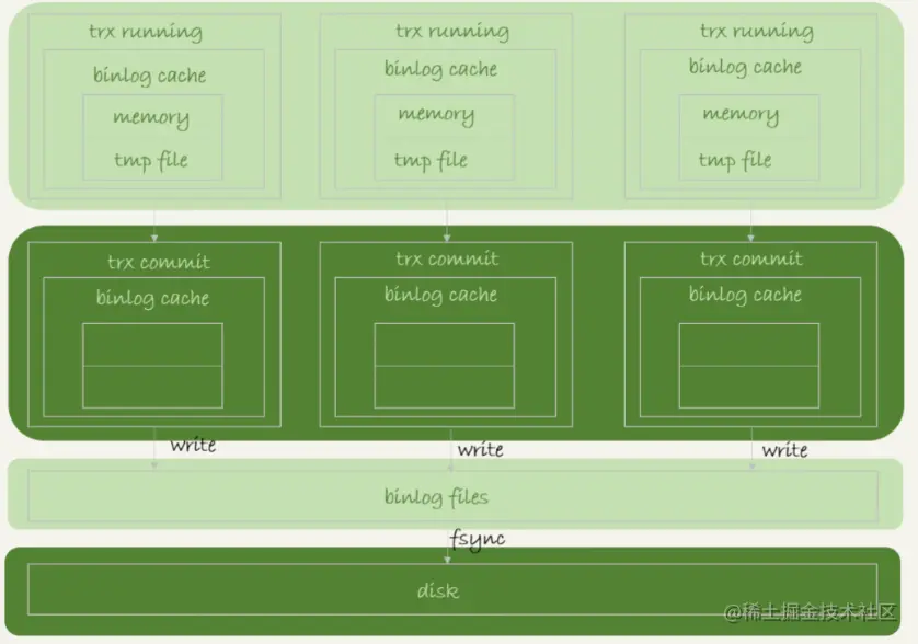 事务执行过程中,先把日志写到 binlog cache,事务提交的时候,再把 binlog cache 写到 binlog 文件中。