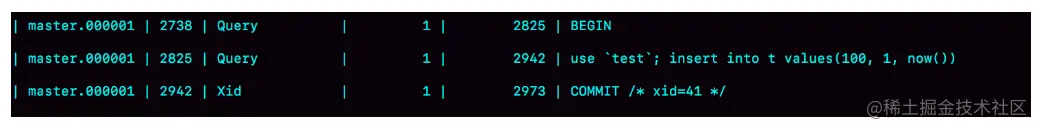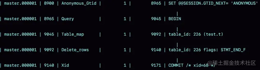 第二行是一个 BEGIN,跟第四行的 commit 对应,表示中间是一个事务;第三行就是真实执行的语句了。可以看到,在真实执行的 delete 命令之前,还有一个“use ‘test’”命令。这条命令不是我们主动执行的,而是 MySQL 根据当前要操作的表所在的数据库,自行添加的。这样做可以保证日志传到备库去执行的时候,不论当前的工作线程在哪个库里,都能够正确地更新到 test 库的表 t。use 'test’命令之后的 delete 语句,就是我们输入的 SQL 原文了。可以看到,binlog“忠实”地记录了 SQL 命令,甚至连注释也一并记录了。最后一行是一个 COMMIT。你可以看到里面写着 xid=61。