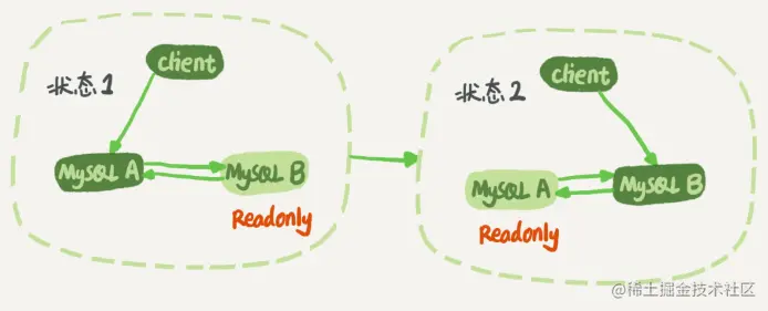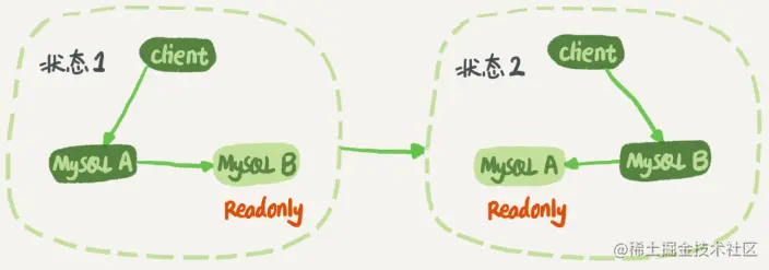 在状态 1 中,客户端的读写都直接访问节点 A,而节点 B 是 A 的备库,只是将 A 的更新都同步过来,到本地执行。这样可以保持节点 B 和 A 的数据是相同的。当需要切换的时候,就切成状态 2。这时候客户端读写访问的都是节点 B,而节点 A 是 B的备库。在状态 1 中,虽然节点 B 没有被直接访问,但是我依然建议你把节点 B(也就是备库)设置成只读(readonly)模式。这样做,有以下几个考虑: