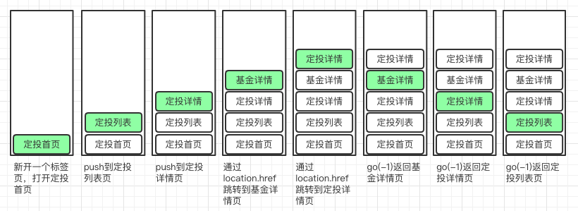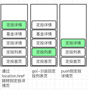 location.href跳转到基金详情页。同样会在路由栈中添加一条记录并展示。 - 通过