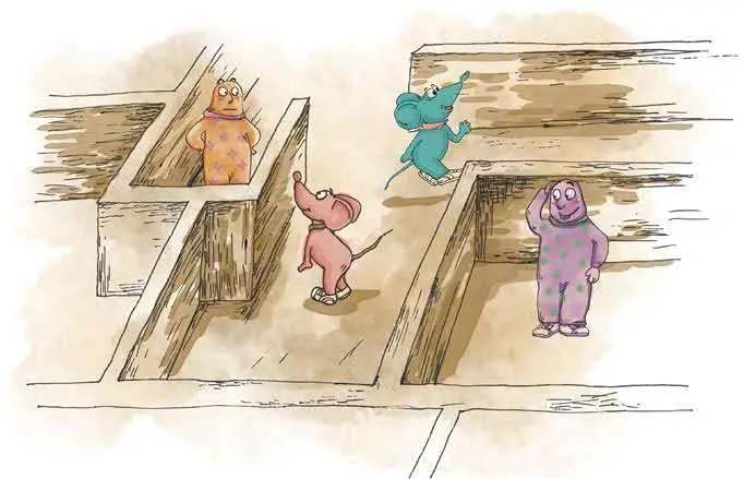 小老鼠嗅嗅和匆匆寻找奶酪的办法很简单:反复尝试。他们沿着一条走廊跑下去,如果里面什么都没有,他们就会转身跑向另外一条走廊。他们会记住那些没有奶酪的走廊,并且迅速奔向新的领域。嗅嗅可以用自己了不起的鼻子嗅出奶酪的大致方向,然后匆匆就会立刻出发跑到前面。就像大家所想的那样,他们也会迷路,也会跑错方向,甚至还经常撞到墙上,但是他们会迷途知返。