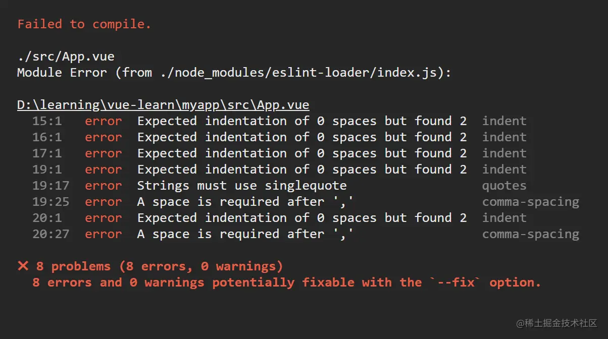 【Vue.js】--8 errors and 0 warnings potentially fixable with the `--fix` option.解决 newzhong 2020-07-19 636 阅读1分钟 问题如下 解决 "lint": "eslint --fix --ext .js,.vue src"