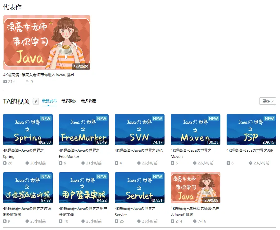 哔哩哔哩,可能喜欢二次元的都看过这个网站,比如我也很喜欢看动漫,那为什么提到这个网站呢,走错片场了?No,是因为这里也有很多优质的学习视频,比如最近看到的一个女老师刚上传的,竟然是 4K,这是我目前发现全网唯一有4K学习视频的网站了,这里我把它贴出来,感兴趣的可以去看看,质量杠杠的,很适合有一点 Java 基础的你,在上面评论也会回复,有的时候看视频有老师带着学效率会比你自学更好,而且是女老师哟,声音很甜美,我不会说是因为这个才分享出来的0.0