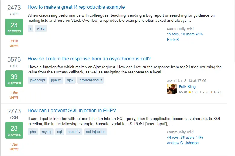 Stack Overflow 可以说是解决问题的杀手锏。下面这些问题是不是都很常见?还有一个最吸引人的是,它不会给你弹任何广告,销售信息,JavaScript 窗口等。