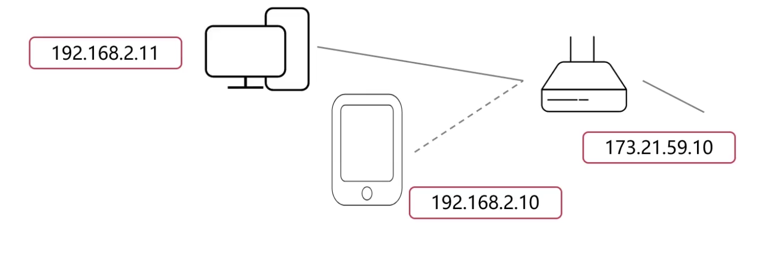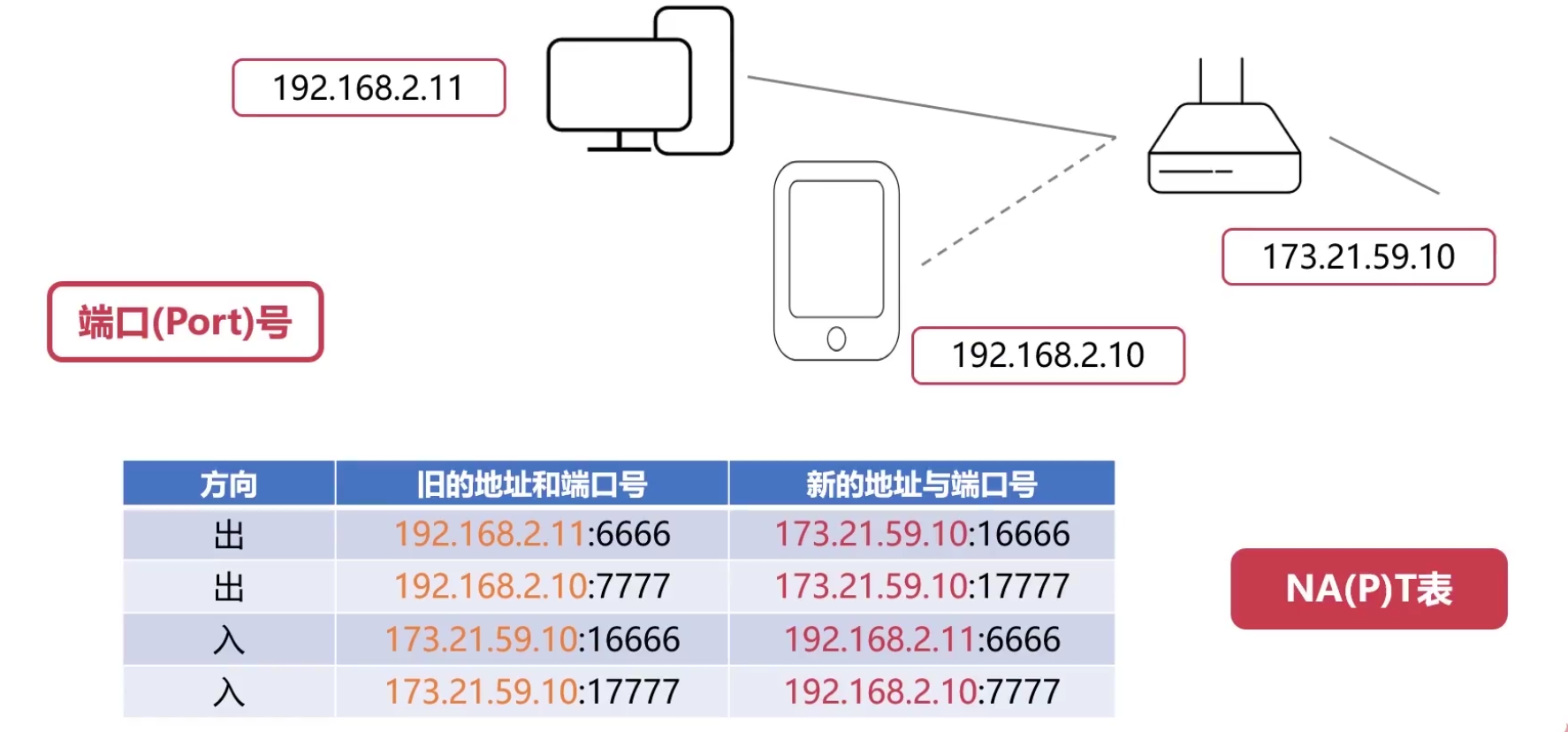 假设有一个计算机和一个手机,通过路由器连接到外部网络,假设外部的IP地址是173.21.59.10。两个内部终端设备的IP地址分别为:192.168.2.10和192.168.2.11