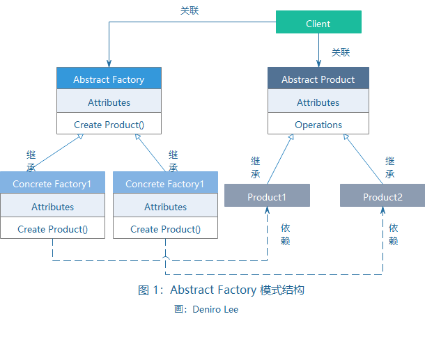 在 Abstract Factory 中, Create Product () 方法与 Abstract Product 是一一对应的,而 Concrete Factory 的数量同实际的 Product 的数量是一致的。