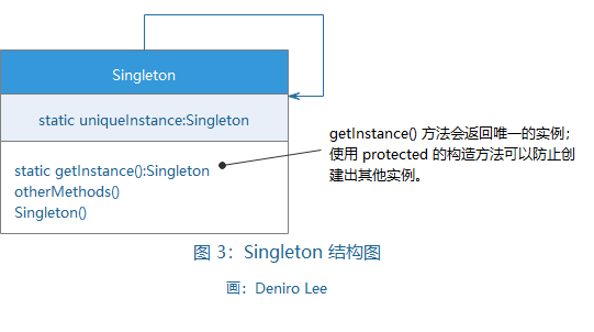 Singleton 模式可以解决上面的问题,其结构如图 3 所示。