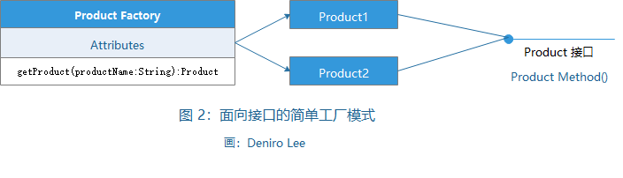 图 2 中所描绘的类就应用了 Abstract Factory 的思想,采用面向接口的方式,简单实现了工厂模式 。 Product Factory 既可以看作抽象工厂 Abstract Factory ,也可以看作具体的工厂(车间) Concrete Factory 。