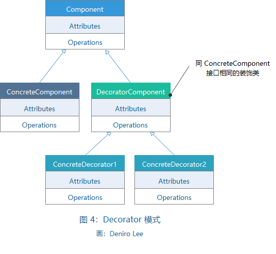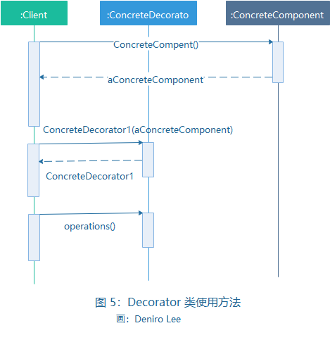 Decorator Component 是 Concrete Component 的装饰类,它们继承自同一个抽象类 Component ,拥有相同的接口。对于 Concrete Component 的装饰可能不止一种,因此又继承出 Concrete Decorator 1 和 Concrete Decorator 2 来作为具体的装饰类。这个结构在类层次上是很清晰的,比静态继承更具有灵活性。图 5 中使用顺序图描述了使用 Decorator 类的方法。