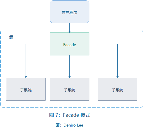 如图 7 所示, Facade 模式通过在原有系统前增加一层的方法,封装这些子系统的接口,对外提供一致的访问接口,解决了上面的问题。