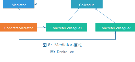 在 Mediator 模式中,一组对象 —— 抽象类 Colleague 的子类,通过中介类 —— Concrete Mediator 进行通信,中介类Concrete Mediator 继承了抽象类 Mediator ,其中需要实现 Mediator 中定义的通信接口,保证中介类和相互通信类之间接口的一致。