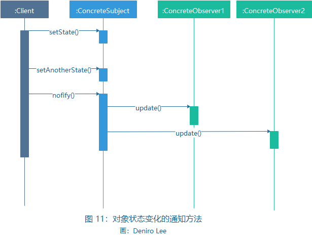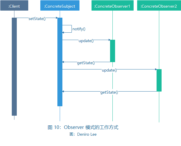 Concrete Subject 中的 setState() 方法表明对象的状态发生了变化,该方法会调用 notify 方法对所有的观察者进行更新,如图 10 所示。