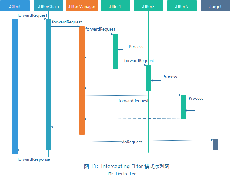 FilterManager 负责调度整个 FilterChain ,它将在请求到达 Target 前拦截请求,并传递给 FilterChain ,由 FilterChain 中的过滤器依次进行预处理。直到请求经过最后一个过滤器后才完成了全部的预处理,然后由 FilterManger 把请求转发给实际的目标。使用 InterceptingFilter 模式时的时序关系如图 13 所示。