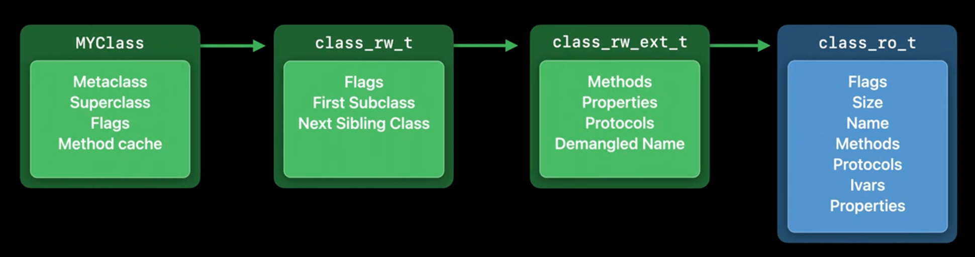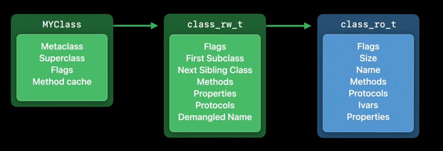 class_ro_t的指针,包含了类的名称,方法,协议,实例变量等等编译期确定的信息。其中 ro 表示 read only 的意思。