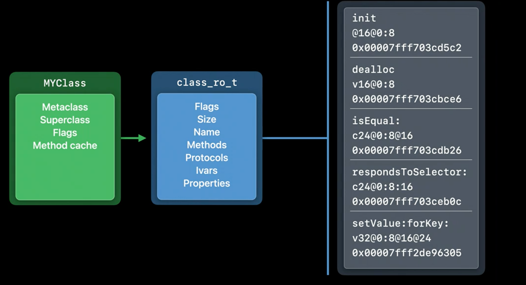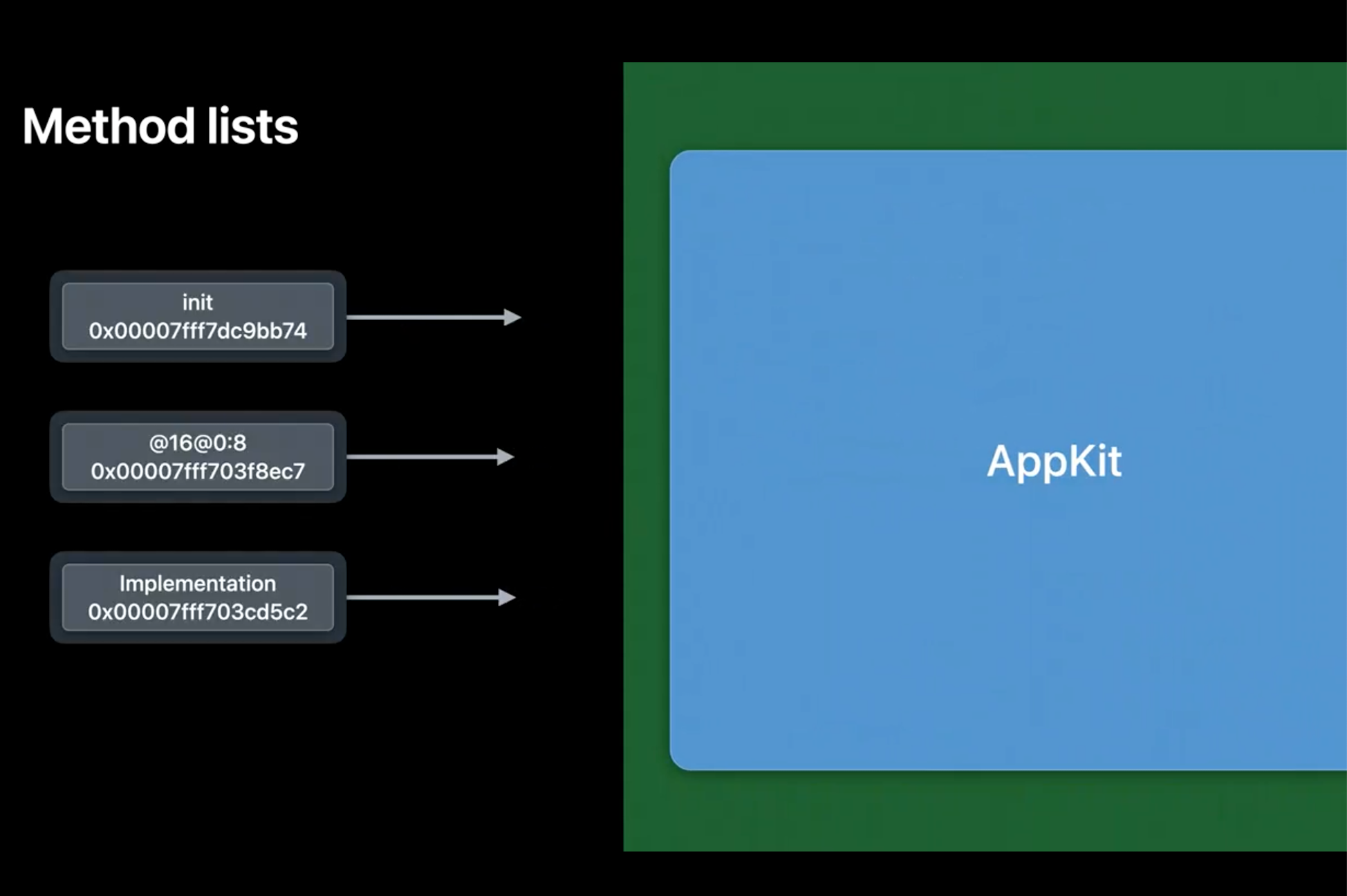 现在,我们来看看 Runtime 的第二处的变化,方法地址的优化。 每个类都包含一个方法列表,以便 Runtime 可以查找和消息发送。结构大概如下图所示: