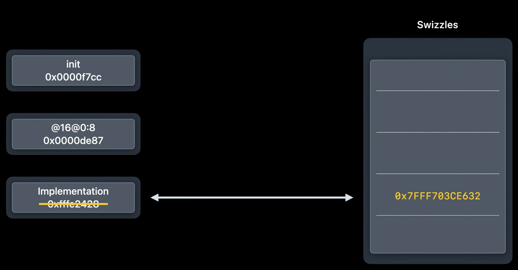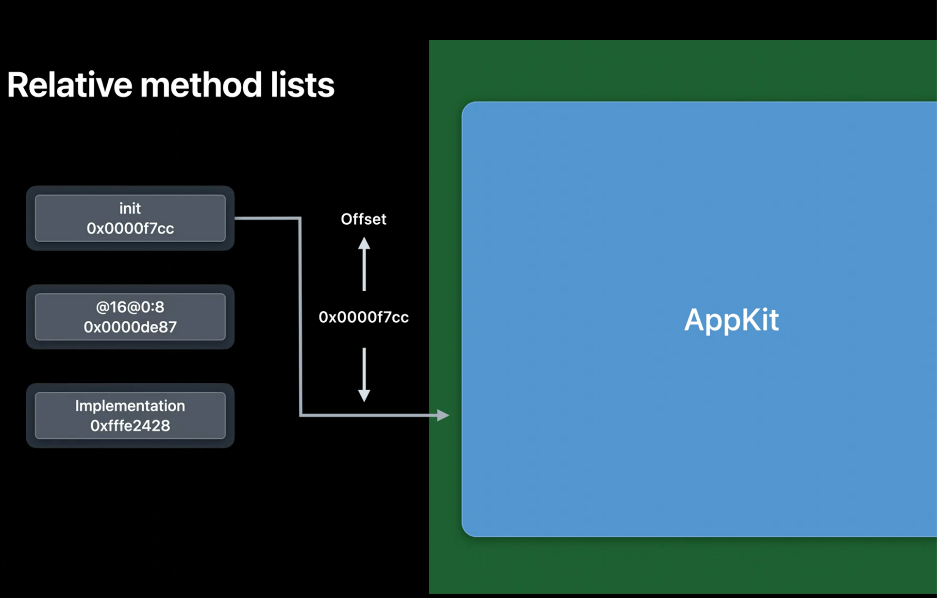 相对方法地址会引发另外一个问题,那就是在Method Swizzling如何处理呢?众所皆知,Method Swizzling替换的是 2 个方法函数指针指向,方法函数实现可以在任意地方实现,使用了相对偏移地址了之后,这样就无法工作了。