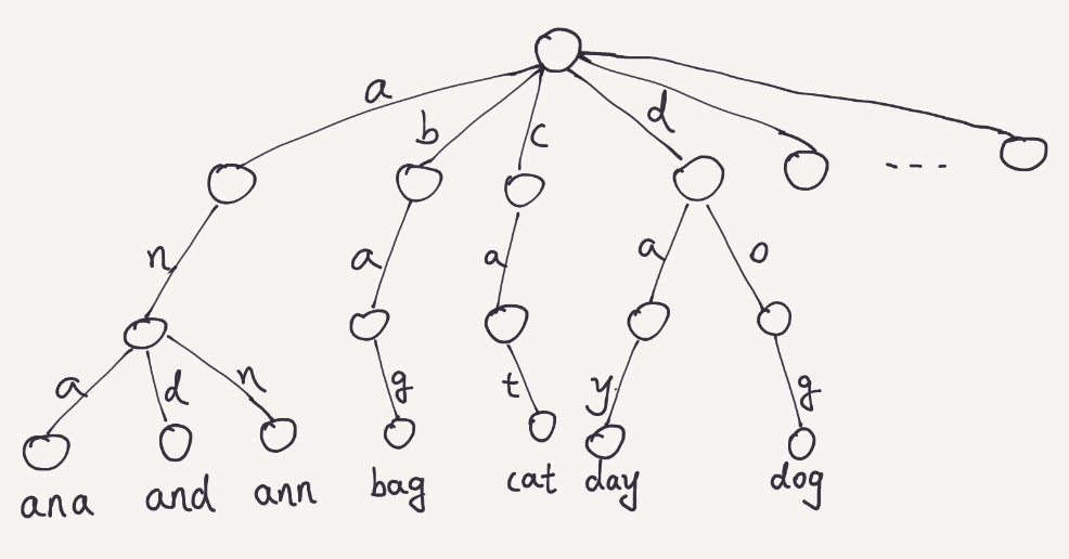 这样存储有什么好处呢?最大的好处就是拥有相同前缀的单词可以共享前缀,比如ana,ann和and这两个单词前两个字符是相同的都是an,所以他们拥有一条公共前缀链路。在这样的结构之下,当我们需要查找单词是否在树中的时候,我们只需要从树根开始遍历,如果能找到对应的结尾节点就说明单词存在,否则就说明单词不存在。