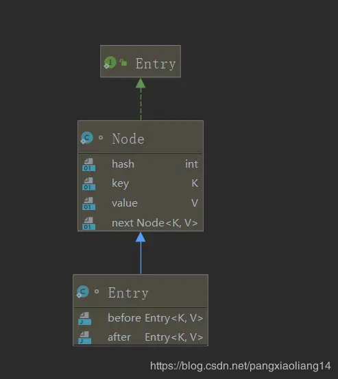 它的Entry<K, V>节点是继承于HashMap的Node, 增加了before指针和after指针, 用于实现双向链表。继承关系如下所示。