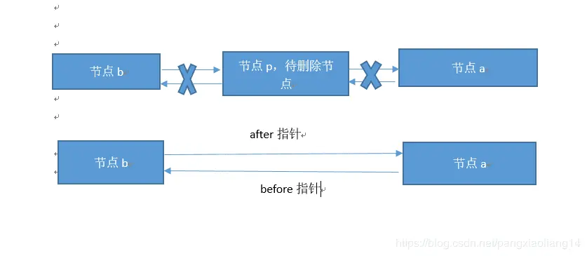 双向链表删除过程,其实就是改变节点的指针指向即可,要注意判断当前节点是否为头节点或者尾节点这两种特殊情况,这也是代码要具备鲁棒性的体现。指针调整过程如下图所示。