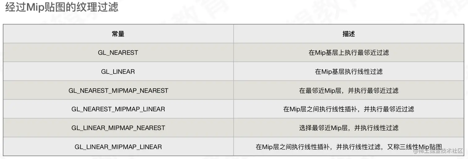 glTexParameteri(GL_TEXTURE_2D,GL_TEXTURE_MIN_FILTER,GL_LINEAR);//纹理缩⼩时,使用邻近过滤