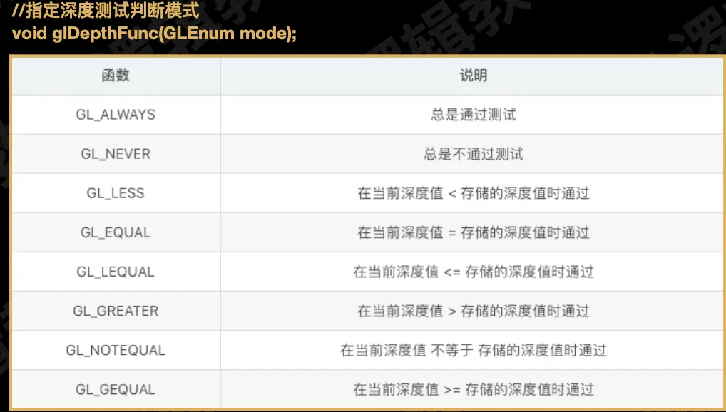 但是这个规则我们一般不会去动,因为这个规则是作为替换像素点值去使用的,例如上面我们判断假如新图层的深度值大于缓冲区的值,那么我们就更新,这个大于就是测试的规则,一般情况下,我们是不去修改他的
