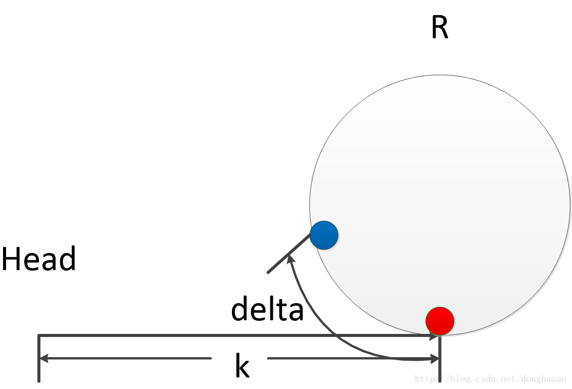 **2. 第二步:**慢指针slow走到了环入口,共走了k步。此时快指针fast越过了环入口的步数为delta。因为快指针可能绕着环走了很多圈,所以有k == delta + n * R,其中R为环的大小,n为快指针绕环走的步数。