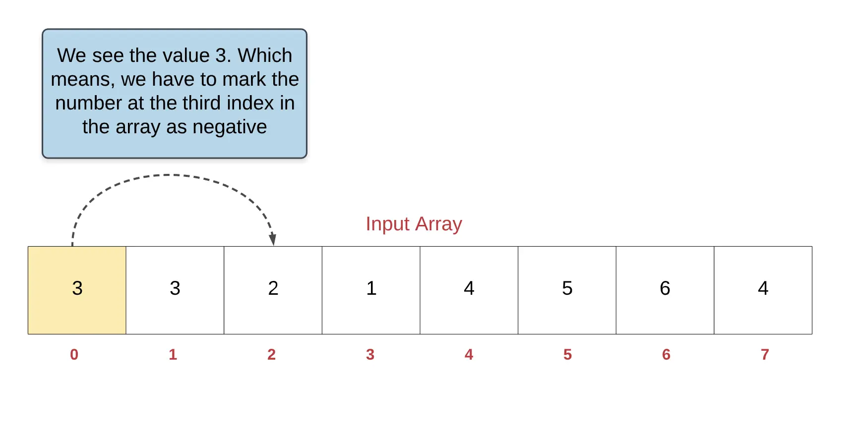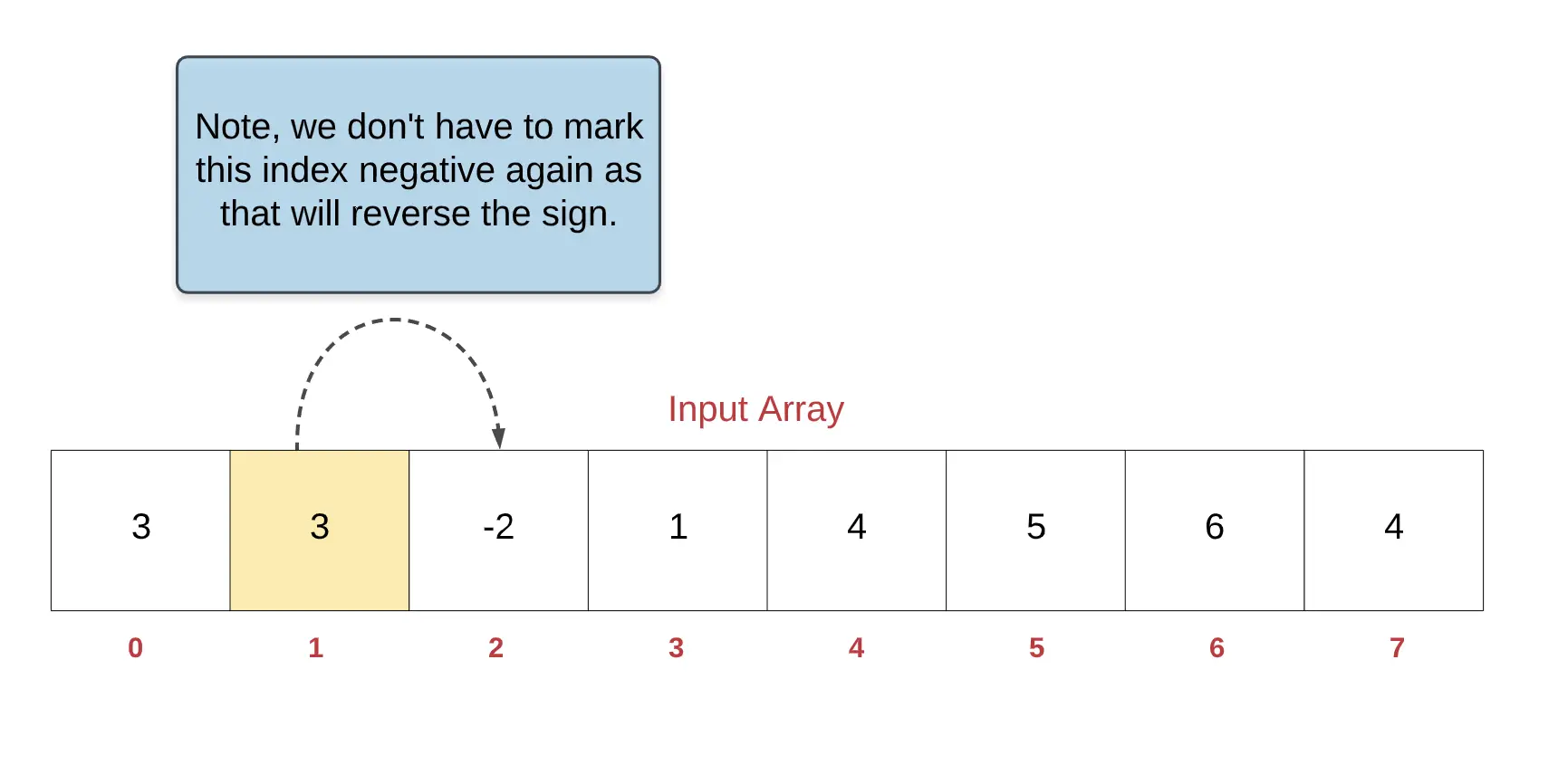 如果不使用额外的空间去解决它,我们可以在输入数组本身以某种方式标记已访问过的数字,然后再找到缺失的数字。