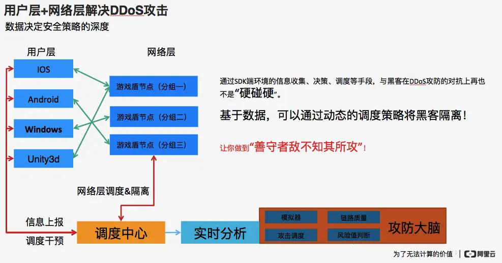 与传统单点防御DDoS防御方案相比,游戏盾用数据和算法来实现智能调度,将“正常玩家”流量和“黑客攻击”流量快速分流至不同的节点,最大限度缓解大流量攻击;通过端到端加密,让模拟用户行为的小流量攻击也无法到达客户端。