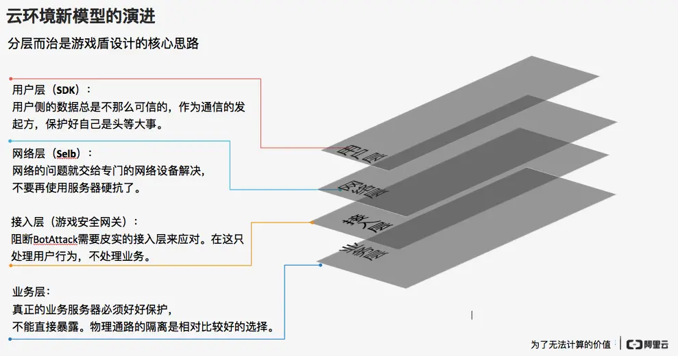 分层而治中的“分”,代表流量的拆分、业务的拆分、和目标的拆分;让攻击者的成本和门槛增大,把用户成本控制到最低;“层”代表一种漏斗模型。以前,我们都是用带宽去硬抗DDoS攻击,而在游戏盾中,我们用最适合的‘武器’去做最擅长的事。