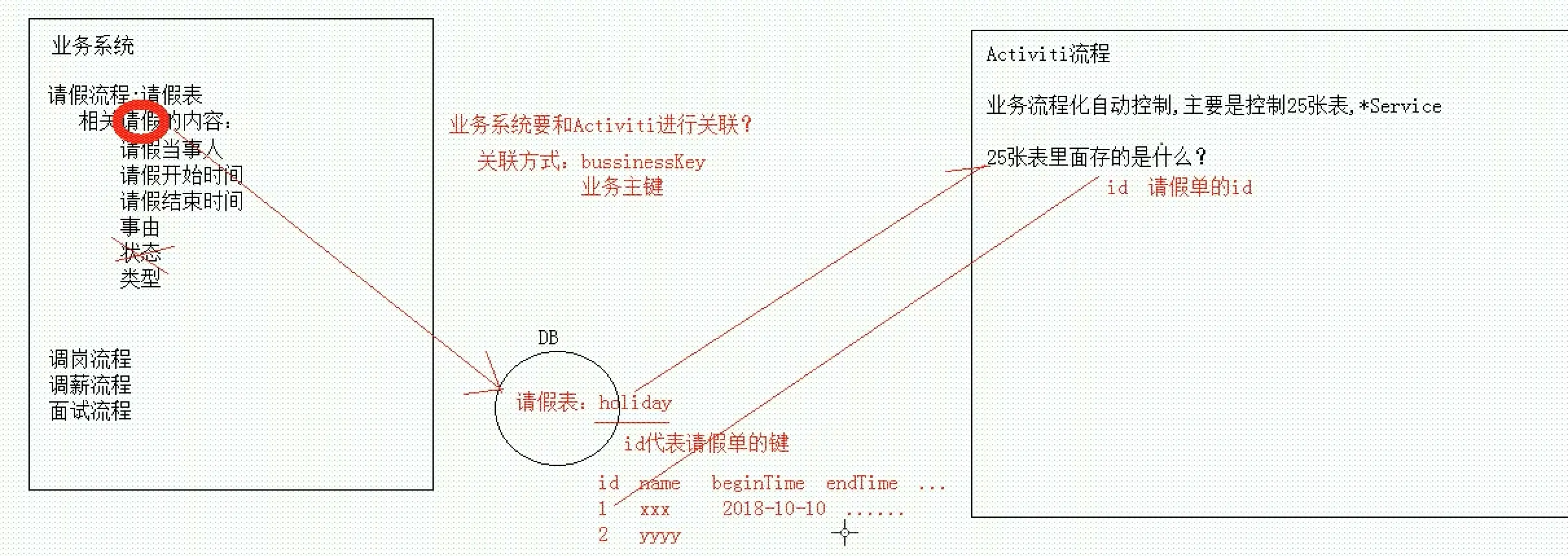 在实际业务中,我们的业务信息会有一张自己的表,而这些信息会存在我们自己系统的表中,而不是Activiti的25张表中,我们会通过BussinessKey将他们进行关联,接下来我们来实现关联。