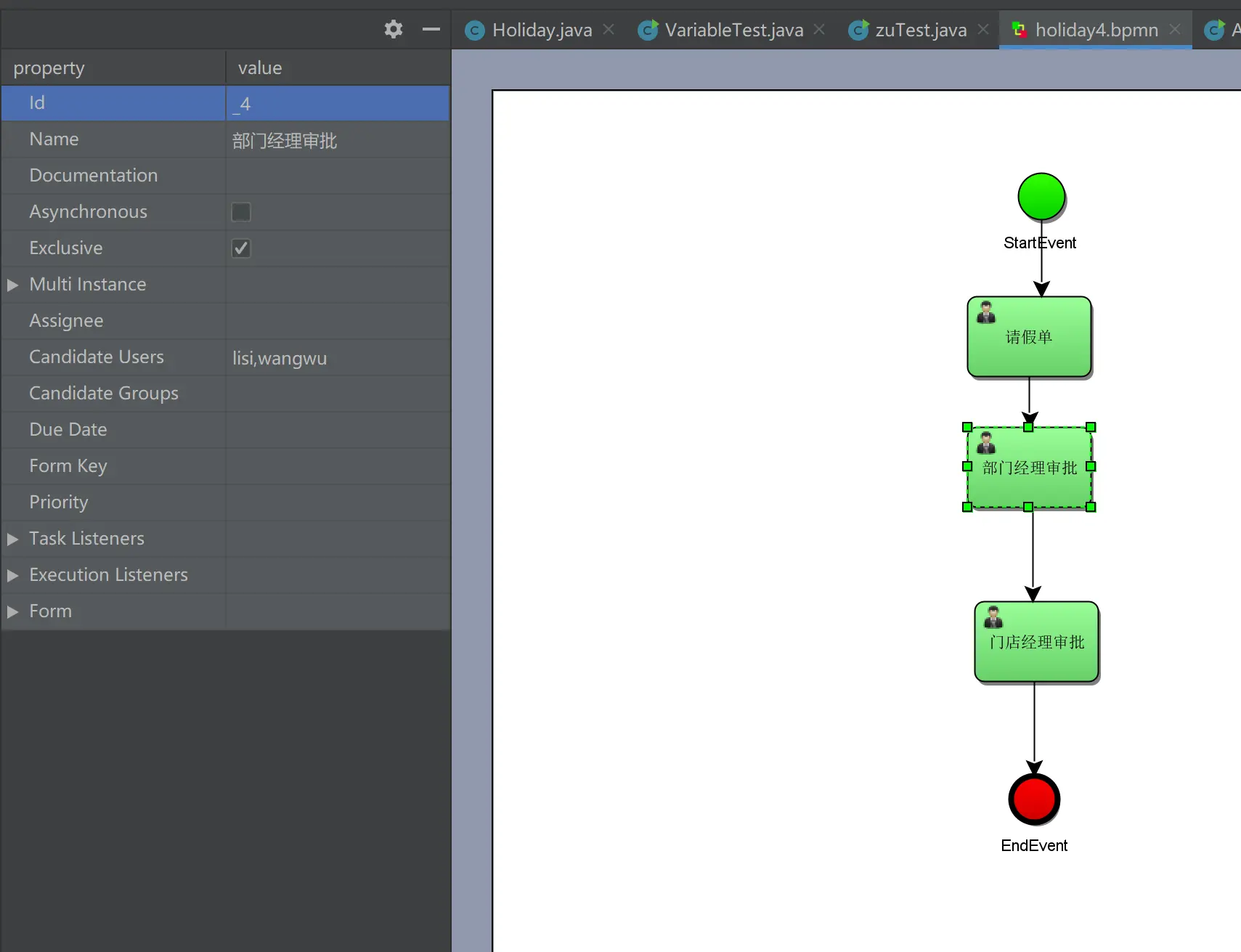 Task task = taskService.createTaskQuery().processDefinitionKey("holiday4").taskCandidateUser(candidate_user).singleResult();