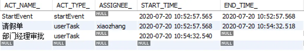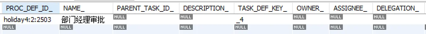 将流程部署,并且启动完成请假单的填写。观察数据库表发现没有负责人。