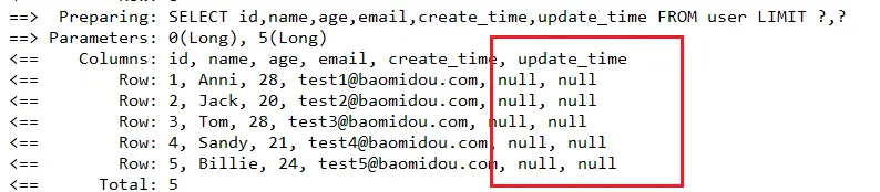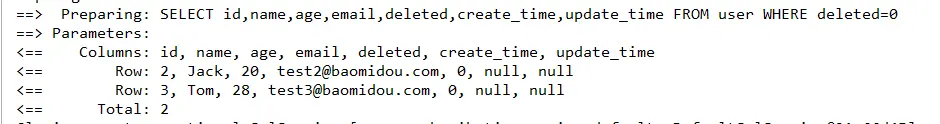 SELECT id,name,age,email,deleted,create_time,update_time FROM user WHERE deleted=0