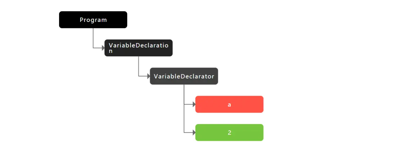 在这个过程由字符串组成的源代码会被分解成有意义的代码块,这些代码块计算词法单元。var a = 2就会被分解成var、a、=、2这些词法单元。 - 解析/语法分析 这个过程的任务就是将分词阶段生成的词法单元流转换成一个由元素逐级嵌套所组成的代表程序语法结构的树。这个数就是大名鼎鼎的抽象语法树(AST,Abstract Syntax Tree)。
