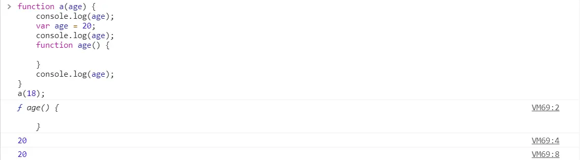 var age = 20;// var age在预编译是已经执行完,引擎执行age = 20, AO{age:function age(){}}变成AO{age:20}