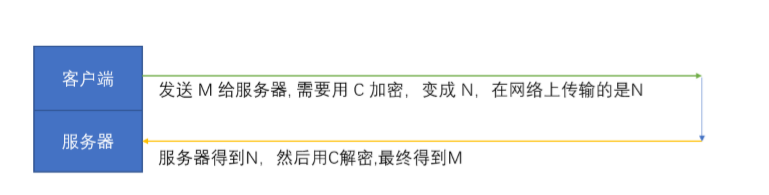 这里 M 指的是明文,我们本意要传输的内容。 这里 C 指的是秘钥,在对称加密算法中需要用秘钥加密,用秘钥解密(加密算 法可以很简单,加减乘除,也可以很复杂)。 这里 N 指的是密文,明文用秘钥加密得到的内容,被称为密文,在网络上传输 的也是密文。 比如客户端向服务器传输 1(明文),1 + 3 (3 是秘钥) = 4 得到密文,进行传输,服 务器得到 密文 4, 4-3(3 是秘钥)=1 得到明文,使得客户端和服务器端进行通信,反 之亦然 对称加密的优点: