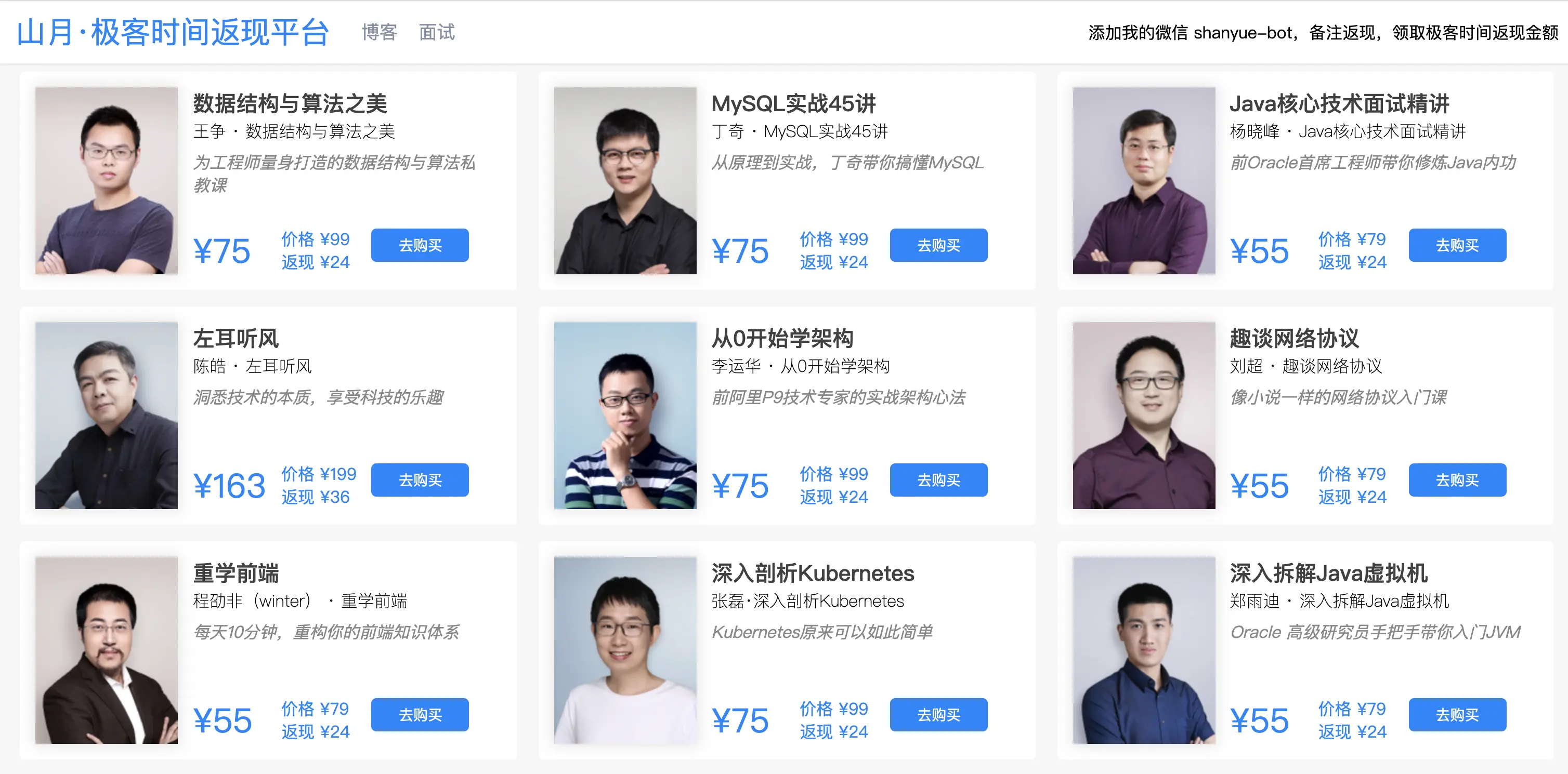 于是山月今天心血来潮做了一个返现平台,方便大家从中购买,并且省了中间差价:「你从平台购买可以加我微信返现中间差价」,这样你可以以更廉价的方式买一个极客时间的专栏。