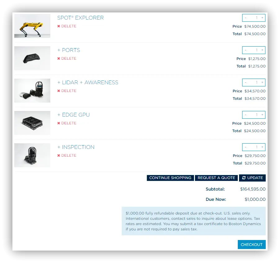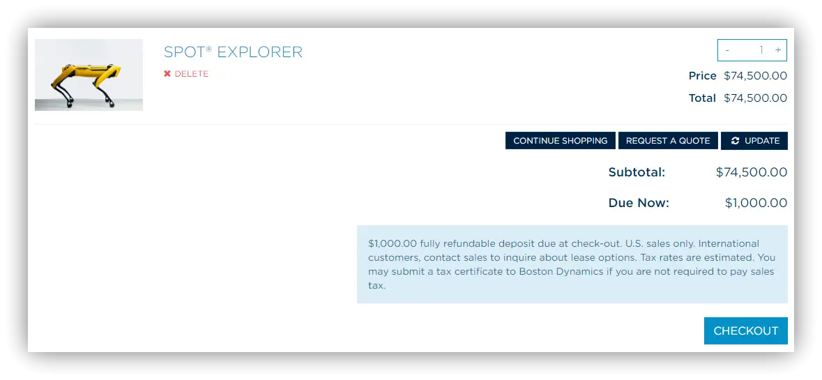 波士顿动力的狗子 总共有3个版本 分别是 探索版, 企业版, 教育版. 其中企业版和教育版本只对有相关资质的企业,高校以及科研机构开放,官方也没有提供线上购买渠道, 而是需要你自己去联系波士顿动力进行沟通购买, 而探索版面向的群体就比较全面了,官网直接提供了在线购买的链接,可以在线付款购买. 本次开箱的版本就是探索版了,因为官方在不久之前开放了探索版的购买入口,这使得 Lew Later 的这次开箱成为可能. 不过我觉得真正促成这次开箱达成的还是油管播主雄厚的财力, 下面的售价大家感受一下: