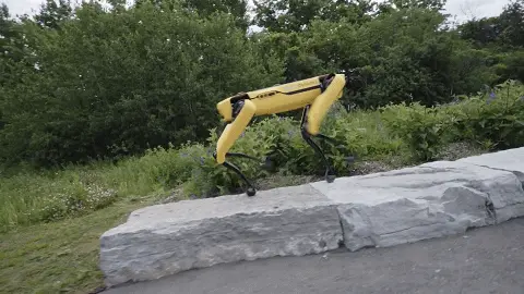 首先这条狗长1.1m,宽0.5m,站立高度0.84m, 坐下的高度是0.191m,净重量32.5kg, 如果带上一块电池的话就是36.4kg,(电池重4.2kg),从这些参数来看的话,这条狗子和家里不要钱的狗子在个子大小和重量方面几乎差不多,不过续航时间远不如家里不要钱的狗子, 这条狗子标配的单电池容量是650Wh, 不带负载的平均运行时间是1.5个小时,如果狗子待机不动,这个电池也仅能支撑3个小时,更加坑的是电池充满电需要2个小时, 充电2小时运行1.5小时,确实给人一种不划算的感觉, 不过好在这块电池 支持交流100-240V 50-60Hz的电源进行充电,直接可以在国内使用, 电池输出的是35-58.6V的直流电,最大输出电流7.2A,可以在0-40度的温度之间正常输出. 狗子的连接方式也很现代化, 支持 WIFI 2.4Ghz b/g/n的无线网络,同时也支持千兆以太网进行连接,同时这条狗子的防水等级是IP54,可以在-20-45度的环境下快活的奔跑, 虽然防水, 续航 和工作温度方面的参数都远不如家里不要钱的狗子, 但是波士顿动力的狗子的眼睛是真的多, 全身配备了5组RGBD相机, 前侧2条, 左右侧各一条, 屁股上面一条, 水平可视范围是360度,传感器的水平探测范围是4m, 可以感受大于2lux的光, 从而确保这条狗子能够看清楚身体周围的任何障碍物并与之保持距离, 避免发生不必要的摩擦. 狗子买回来是要拿出去溜的, 这条狗子的运动性能如何呢? 最高速度1.6m/s, 可以上下 ±30°的斜坡, 和高度为300mm的台阶, 这个运动能力, 在现在的机器人世界绝对可以说是一骑绝尘了, 而且这条狗子可以连接其他的高精度的传感器模块,来支持更高精度的视觉范围和更加灵活的运动能力, 狗子的背部有 850 mm (L) x 240 mm (W) x 270m m (H)大的区域可以用来放东西, 可以直接把官方的扩展模块放到这里, 这条狗子的最大负重是14kg, 用来装官方的那些配件是足够了, 而且狗子身上还有两个DB25的接口, 可以用来传输数据和供电, 支持35-58.8V的直流电输出, 每个接口的输出功率是150W, 可以允许你通过硬件接口去控制狗子也可以通过官方提供的软件接口用Python来控制狗子, 而且官网还为这条狗子配备了一个7寸的安卓控制器,分辨率是1920x1200, 大小是:143.6 mm(H)x274 mm(W)x53 mm(H) 是不是感觉很棒, 这条狗子绝对比家里不要钱的狗子听话多了. 我放几张图让大家感受下这条狗子出色的运动能力: