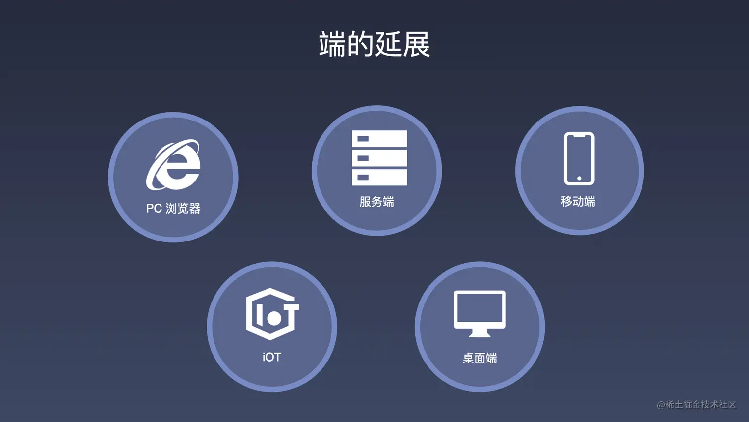 随着 HTML5 标准的制定,以及移动端设备技术的发展,前端工程师也可以更多的拥抱面向移动端场景的开发。也出现了像今天上午两位讲师所讲到的移动端领域 React Native 这样的跨平台技术方案。随着移动 APP 成为一个主流,基于这些智能化的设备以及芯片的计算能力,前端也普及到了物联网设备方向,前端可以拥有了面向 Iot 的开发能力,也诞生了像 Thing.js 这样的面向物联网设备开发的 Js 框架。