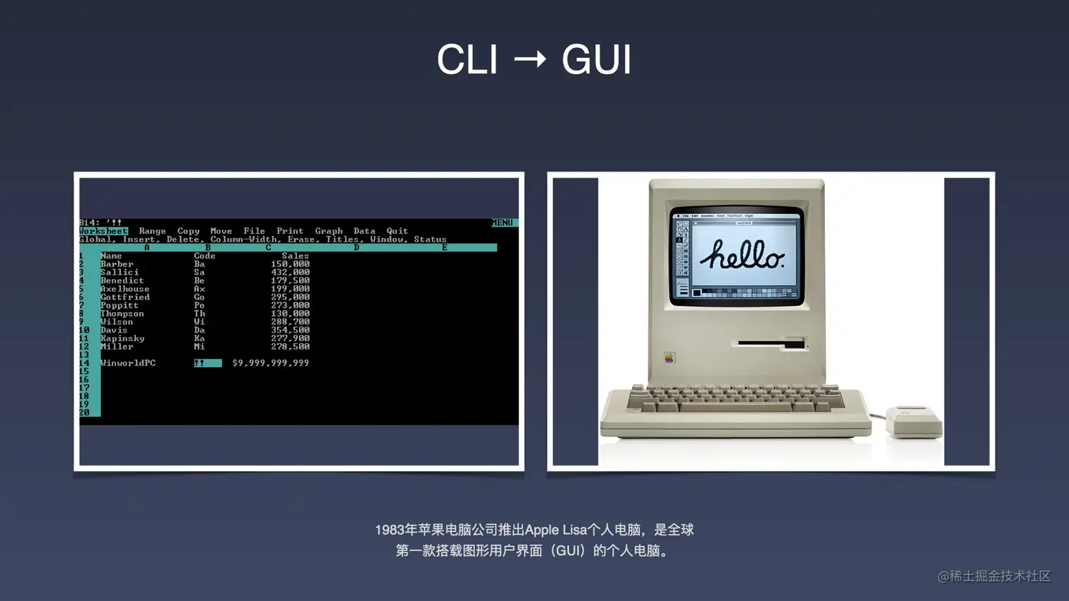 大家看到左边这张图,是早期电脑的 DOS 系统的运行的截图,右边则是 1983 年苹果电脑发布的第一款 Apple Lisa 个人电脑,它是全球第一款搭载图形用户界面(也就是我们所说的 GUI)的一台个人电脑,正是因为这款电脑的问世,让后期个人电脑大众化的普及得以实现。为什么它会带动个人电脑的普及化,是因为图形界面对于用户来说,在视觉上更容易接受,学习的成本也是大幅的下降。相信用过 MAC 系统的同学都会对苹果优秀的界面设计以及整体的交互体验,有比较深刻的感受。