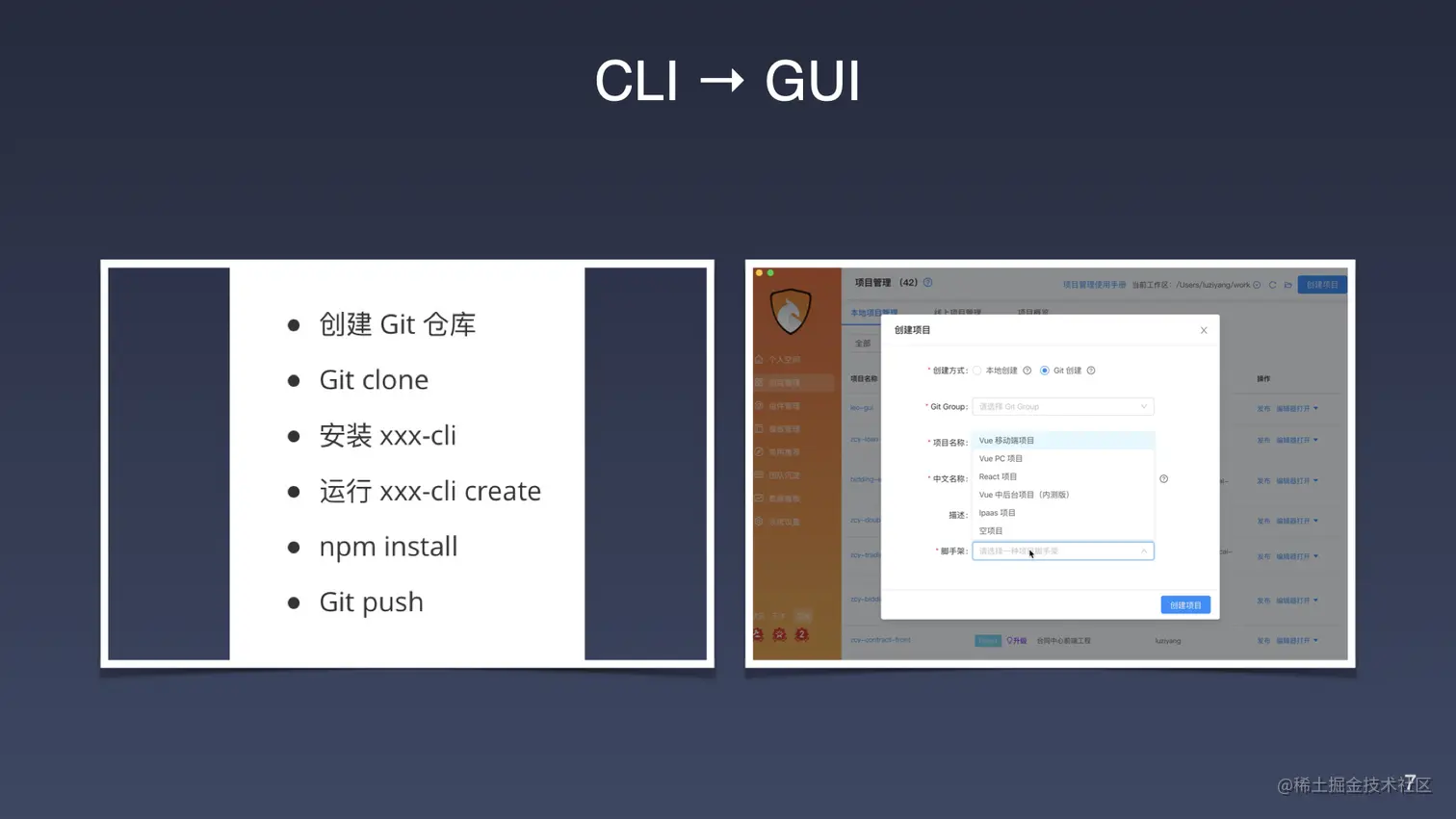 左边这个流程相信大家不陌生,在我们开始新项目开发的时候,可能需要做哪些事情?首先第一步可能是需要去创建一个 Git 仓库,创建完成之后将仓库克隆到本地,然后通过团队内部的 CLI 工具的安装之后,去执行例如 xxx-cli create 这样的命令去创建一个项目。创建项目完成之后,如果想进行开发,我们需要去运行 npm install ,安装所需的依赖包,最终将整个项目提交到 Git 仓库上去。这是我们新项目的创建,基于 CLI 方式的一个操作流程。