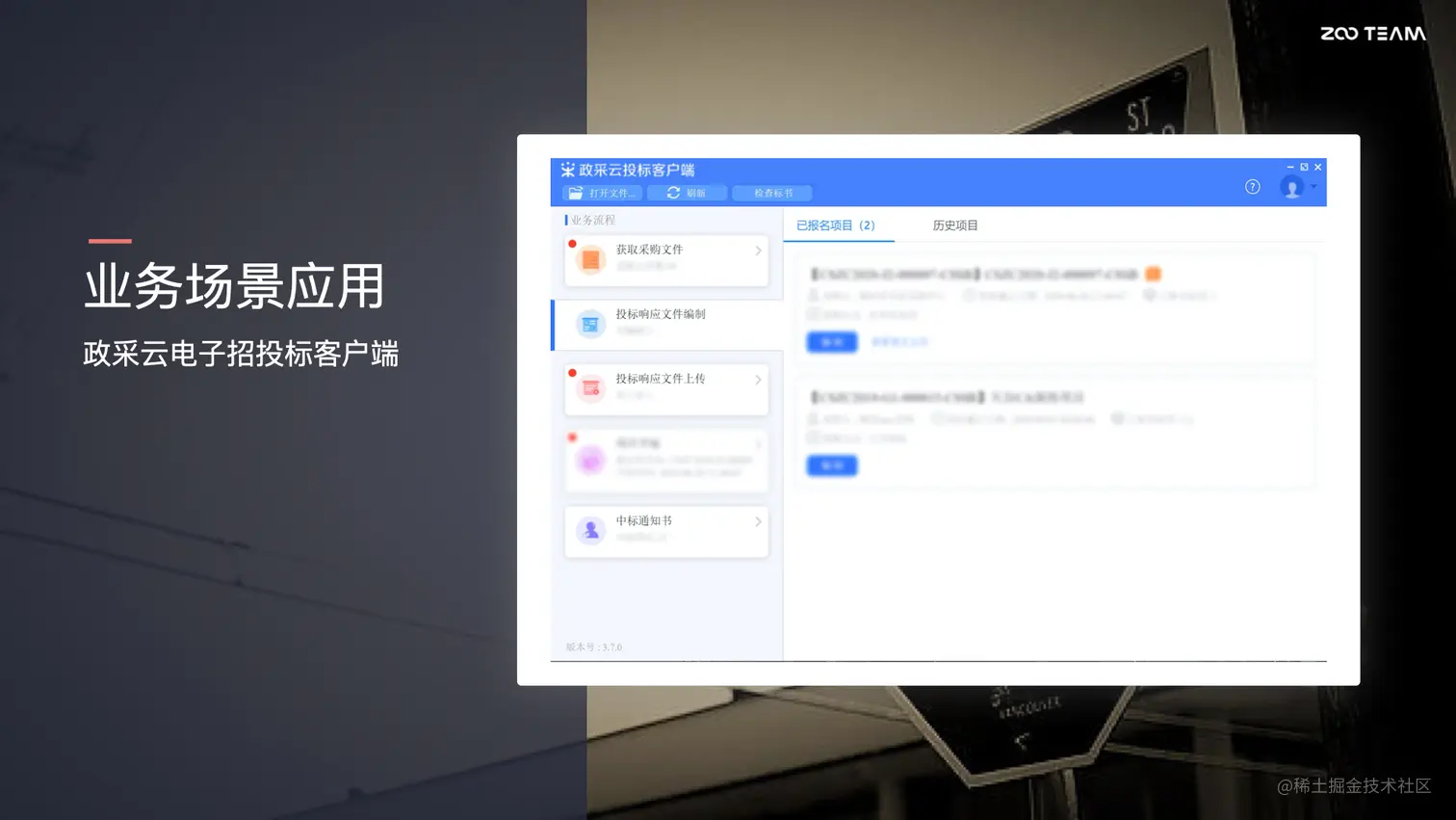 下面是基于 Electron 开发的一些重点应用的落地场景。这是我所负责的政采云电子招投标客户端的业务。它主要的功能是帮助用户由传统的线下招投标,纸质的标书,转变为电子标书,我们提供这样的客户端可以帮助用户串联整个制作标书的流程。同时基于 Electron 所提供的 Node.js 的能力,用户本地标书文件的读写,以及本地文件的加解密操作,都可以在客户端里面完成。