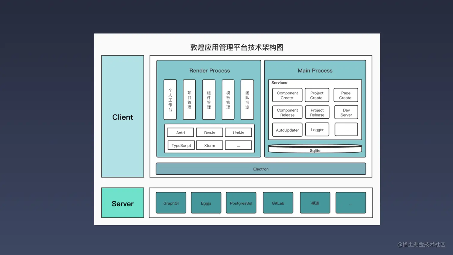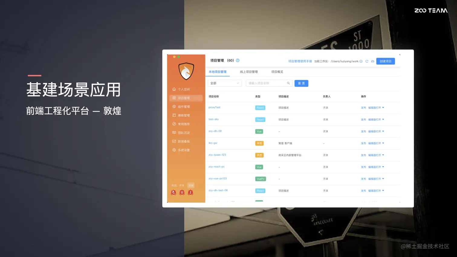 这边是 Electron 在我们的工程化平台上的实践,这就是我们前面所提到的前端工程化平台-敦煌。它主要做的内容是对整个前端研发流程的托管,像我们刚才所提到的项目创建就是其中的一个环节。下面我们还会详细的介绍一些这方面的应用。