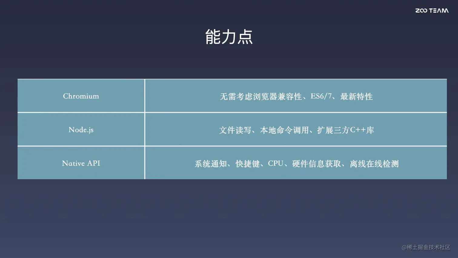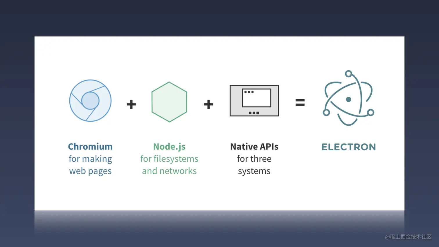 - Node.js 则是提供了一个文件读写、本地命令调用、以及第三方扩展的能力,并且基于 Node.js 整个强大的生态,将近几十万的 Node.js 模块都可以在整个客户端内使用。