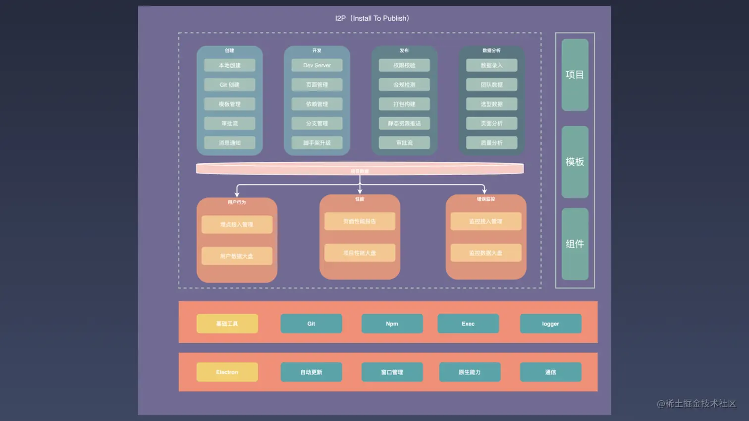 这边是我们整个前端应用管理平台的系统架构,大概看一下。核心流程就是上面所写到的一个 I2P 的概念,就是 install to publish 。它完成了组件、模板和项目这三个级别,从创建到发布的全流程托管。