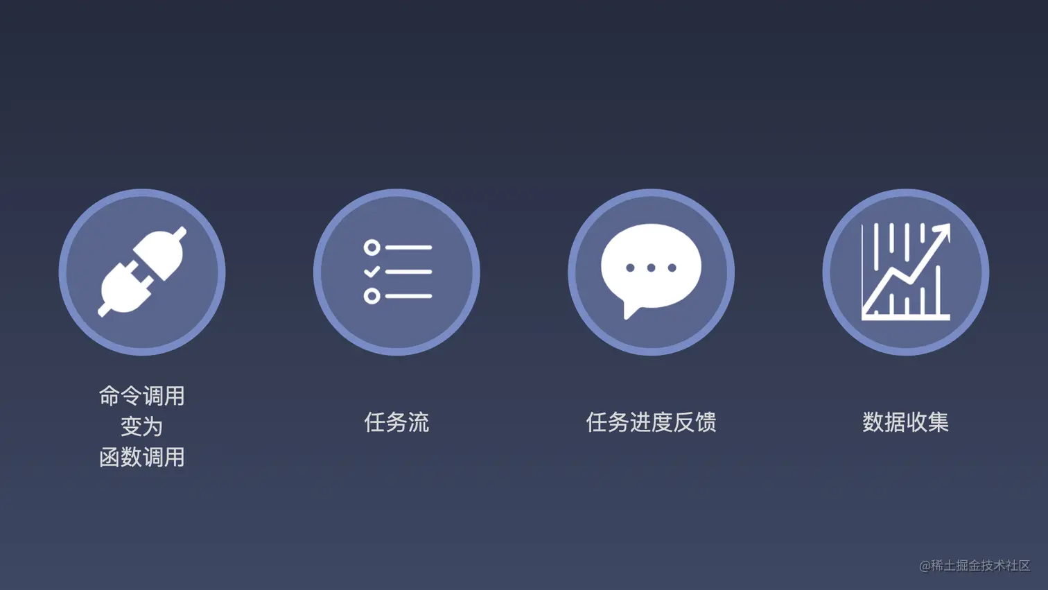 下面我们就具体来看一下如何实现由一个单点命令到任务流这样的一个串联。将单点命令的操作变为任务流的串联模式,我们要从以下 4 个切入点来实现。 • 首先我们要将常规的一些命令调用变为函数式的调用。 • 基于这些函数式的调用,进行一个任务流的编排和组装,根据实际的开发场景,去定制一个任务流。 • 第三块我们所需要的是整个任务流的任务进度反馈机制,如何将任务执行,通过 GUI 的能力,让用户可以直观感受到整个任务的执行链路和进度。 • 最后,在整个任务流中,很重要的一块就是对整个流程的数据收集。