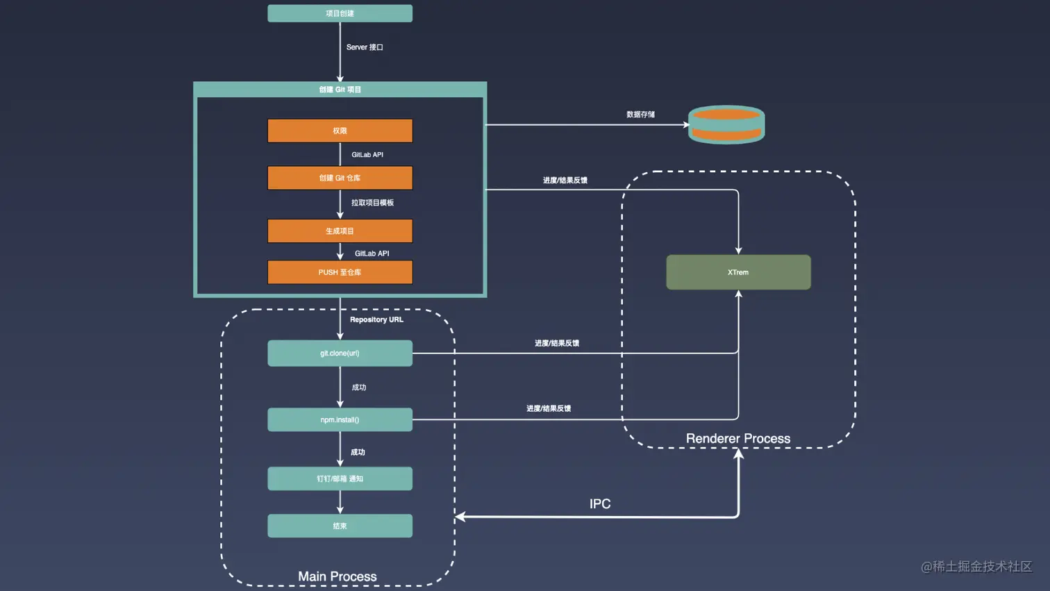 下面是我们刚才所演示的项目创建流程的架构设计。当我们在调用项目创建模块的时候,首先会通过 Server 接口,去创建 Git 项目。先对整个用户的权限做一层校验,校验通过之后,通过调用 Gitlab API,进行一个仓库的创建,之后,根据所选用的模板信息拉取统一维护的项目模板,根据用户所输的项目名称、项目描述等信息,来生成真正的项目文件,调用 Gitlab API 将整个项目文件推送到创建好的仓库。关于 Gitlab API 的使用这一块,在掘金上有进行过文章的分享,大家感兴趣的话可以去了解一下,这边就不再进行详细的阐述。在我们整个服务端完成了一系列的 Git 创建操作之后,会将创建成功的仓库 url,给到我们的桌面端,桌面端接收到这样创建成功的任务结果之后,开始执行一些本地操作的任务流程。将 Git 仓库克隆到本地的工作区内,同时完成整个项目的依赖安装。在依赖安装之后,我们会借助桌面端的通知能力,包括钉钉的接口去完成通知和反馈。 其中克隆、依赖的安装以及通知反馈是在我们桌面端的主进程内完成的。在我们整个任务流中,它有实时与渲染进程的消息反馈。我们会将整个任务的进度,包括命令执行的日志输出、命令执行结果,通过 IPC 的方式实时的与渲染进行通信,最终在界面上给到用户反馈。在整个流程中,也会对项目数据和流程数据进行存储。
