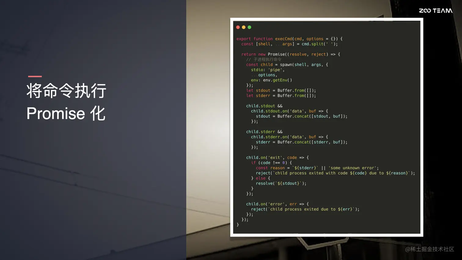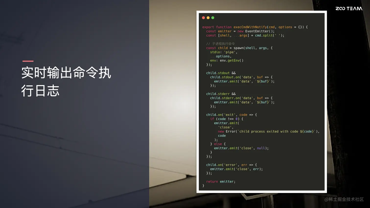 在另外一个场景,比如说 npm install ,依赖安装,或者说启动本地开发服务,整个命令的执行过程可能会比较长,我们更关注的是过程中实时的日志输出。我们怎么来做呢?